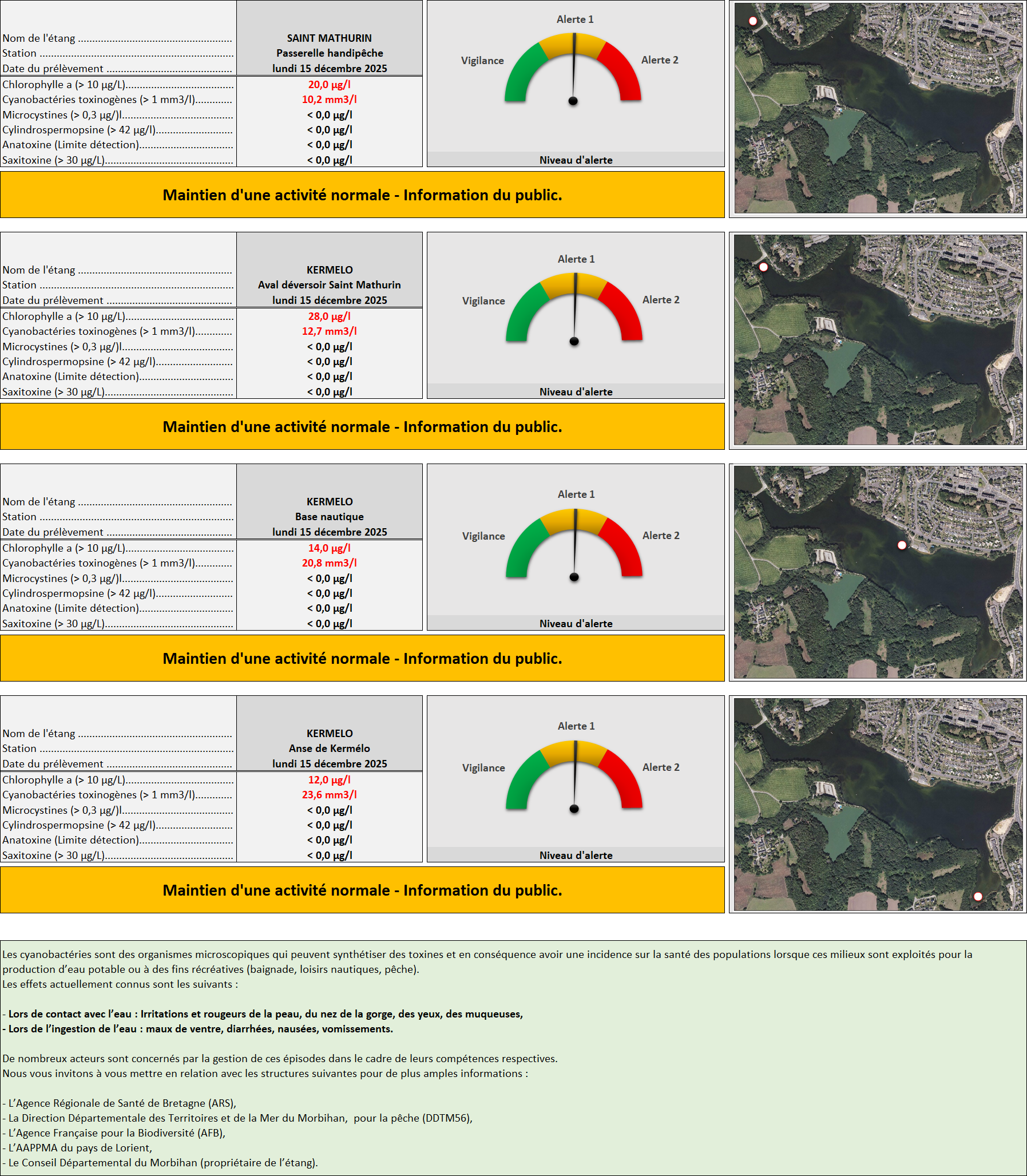 Suite aux prélèvements effectués par Lorient Agglomération le lundi 15 décembre 2025, voici les résultats du dénombrement en cyanobactéries des étangs du Ter :