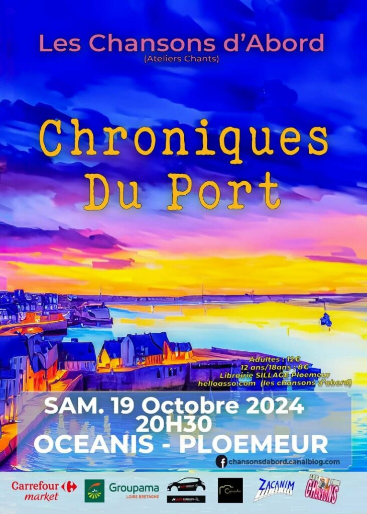 « Chroniques du port sera une promenade musicale dans une atmosphère maritime. Le voyage, la vie, les nuits, les travailleurs du port seront des thèmes abordés en chansons. Avec une mise en scène et des décors, les musiciens et les chanteurs auront à cœur de vous embarquer dans des chansons entraînantes, ou émotionnelles…