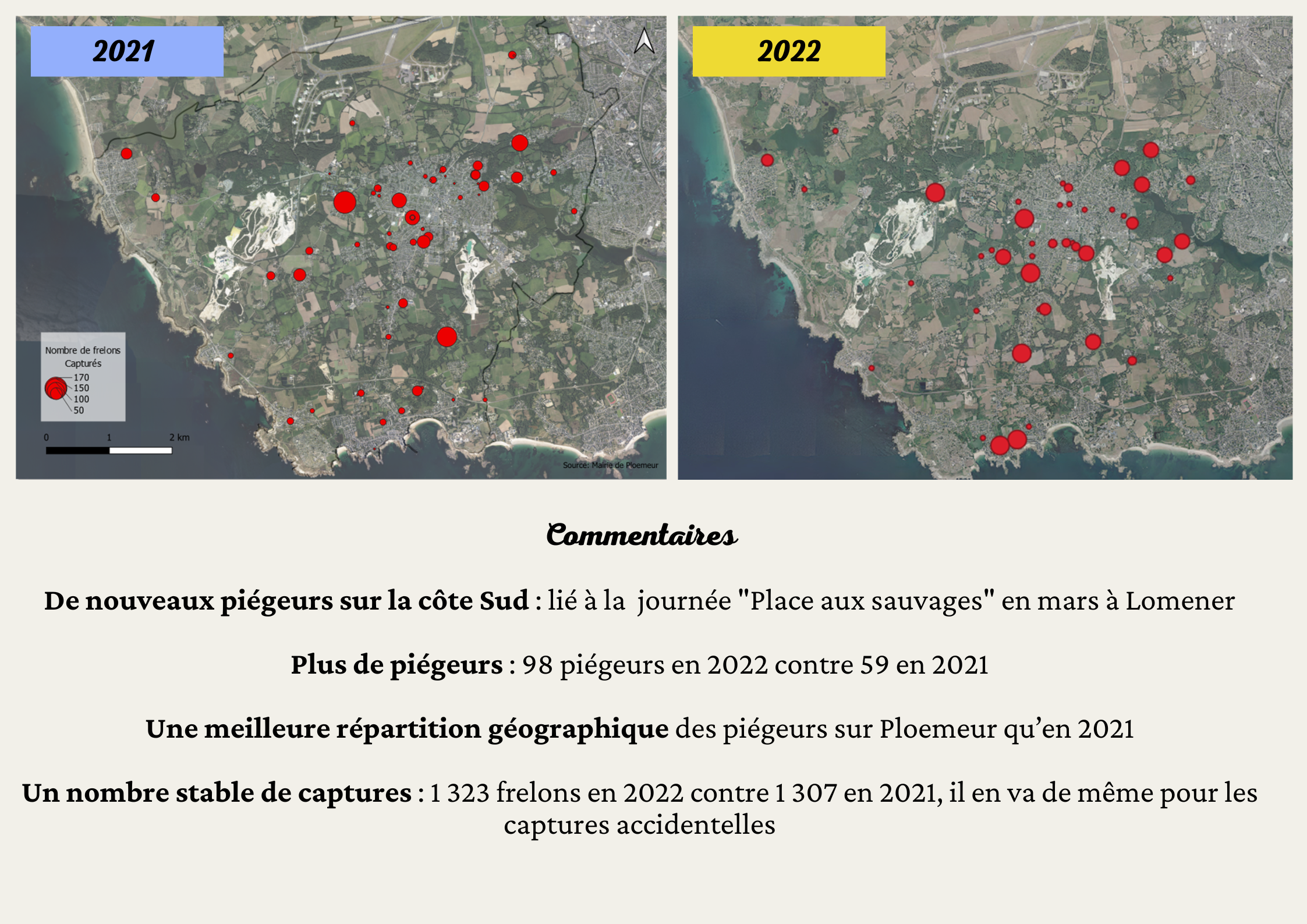 La Ville de Plœmeur remercie les piégeurs qui se sont mobilisés et sans qui ces résultats n’auraient pas été atteints. L’opération sera renouvelée l’an prochain en espérant accroître encore le réseau afin de parvenir à réduire significativement l’invasion de frelon asiatique sur notre territoire.
